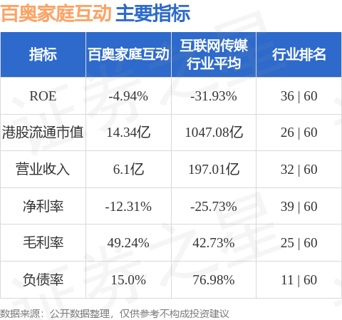 百奥家庭互动港股市值14.34亿港元,在互联网传媒行业中排名第26。主要指标见下表: