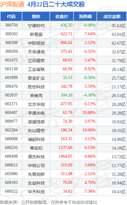 当日北向资金余额额度充足,金螳螂(002081)领涨,涨幅10.02%,交易所公布的沪深股通二十大成交股中成交额前三的为宁德时代、新易盛、中际旭创,成交额分别为95.63亿元、63.91亿元、62.67亿元。详情可见下表: