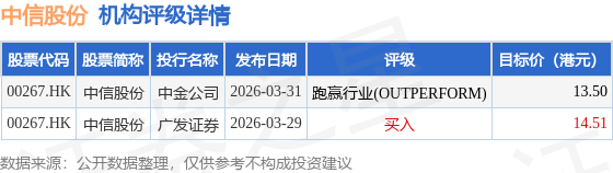 截至2026年4月22日收盘,中信股份(00267.HK)报收于12.91港元,上涨1.33%,成交量2462.5万股,成交额3.16亿港元。投行对该股的评级以跑赢行业(OUTPERFORM)为主,近90天内共有1家投行给出跑赢行业(OUTPERFORM)评级,近90天的目标均价为14港元。中金公司最新一份研报给予中信股份跑赢行业(OUTPERFORM)评级,目标价13.5港元。