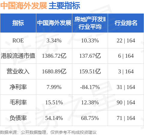 中国海外发展港股市值1386.72亿港元,在房地产开发Ⅱ行业中排名第6。主要指标见下表: