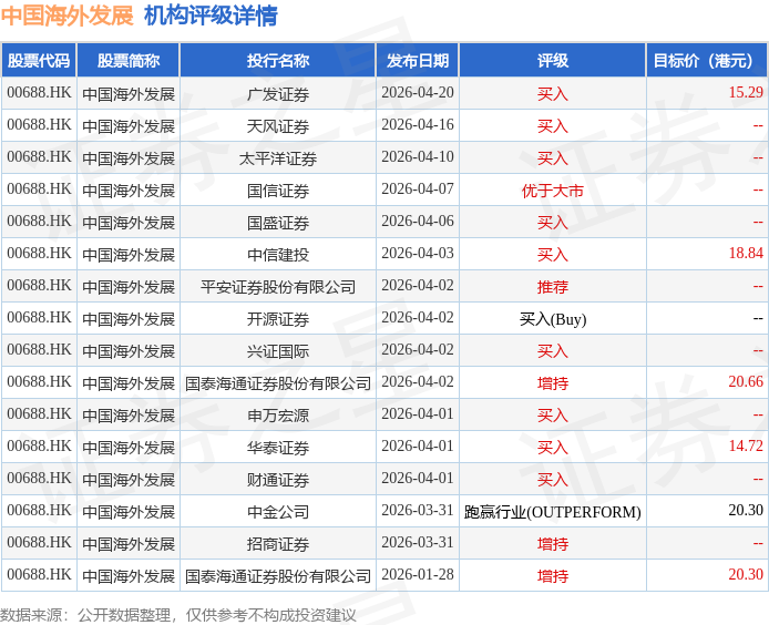 截至2026年4月22日收盘,中国海外发展(00688.HK)报收于12.63港元,下跌0.32%,成交量934.56万股,成交额1.18亿港元。投行对该股的评级以买入为主,近90天内共有9家投行给出买入评级,近90天的目标均价为18.35港元。广发证券最新一份研报给予中国海外发展买入评级,目标价15.29港元。