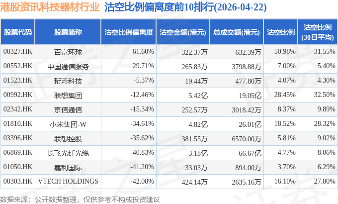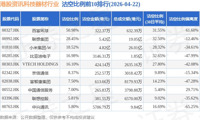 从沽空比例来看,百富环球、联想集团、小米集团-W沽空比例位居行业前三,分别为50.98%、28.45%、18.52%。