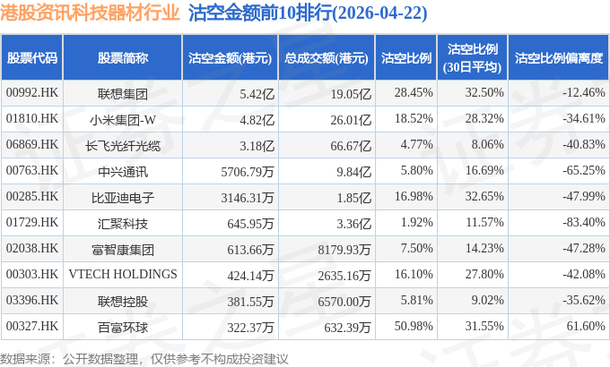 从沽空金额来看,联想集团、小米集团-W、长飞光纤光缆沽空金额位居行业前三,分别为5.42亿港元、4.82亿港元、3.18亿港元。