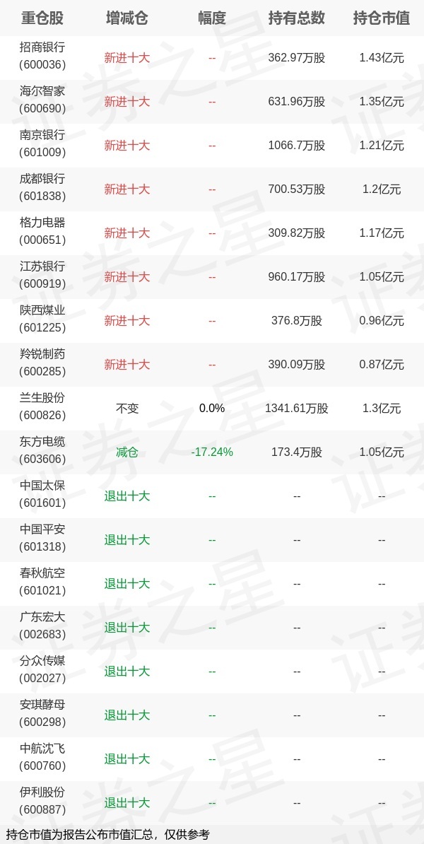 证券之星消息,4月22日天弘基金旗下张寓 杜广管理的天弘永利债券型基金公布一季报,近1年净值增长率5.44%。与上一季度相比,该基金前十大重仓股新增招商银行,海尔智家,南京银行,成都银行,格力电器,江苏银行,陕西煤业,羚锐制药;其中招商银行持仓占比0.88%,为该基金第一大重仓股;中国太保,中国平安,春秋航空,广东宏大,分众传媒,安琪酵母,中航沈飞,伊利股份等退出前十大重仓股;详细数据如下: