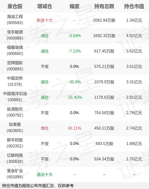 证券之星消息,4月22日东方红资产管理旗下张伟锋管理的东方红睿玺三年持有期混合型基金公布一季报,近1年净值增长率27.69%。与上一季度相比,该基金前十大重仓股新增海油工程;其中宝丰能源持仓占比8.96%,为该基金第一大重仓股;紫金矿业等退出前十大重仓股;详细数据如下: