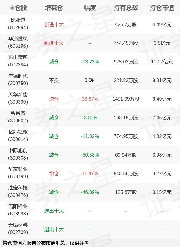 证券之星消息,4月22日摩根基金(中国)旗下杜猛管理的摩根新兴动力混合型基金公布一季报,近1年净值增长率145.35%。与上一季度相比,该基金前十大重仓股新增比亚迪,华通线缆;其中东山精密持仓占比9.36%,为该基金第一大重仓股;洛阳钼业,天赐材料等退出前十大重仓股;详细数据如下:
