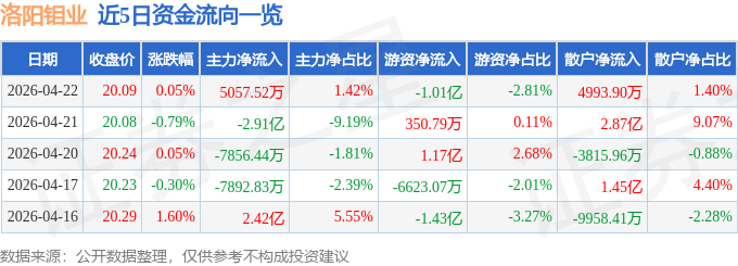 证券之星消息,截至2026年4月22日收盘,洛阳钼业(603993)报收于20.09元,上涨0.05%,换手率1.02%,成交量178.16万手,成交额35.72亿元。