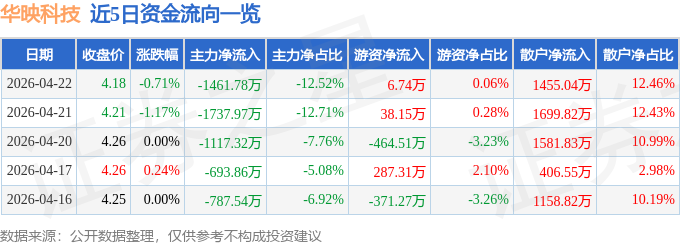 证券之星消息,截至2026年4月22日收盘,华映科技(000536)报收于4.18元,下跌0.71%,换手率1.01%,成交量27.94万手,成交额1.17亿元。