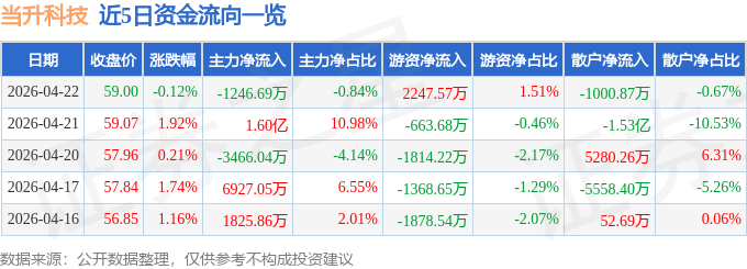 证券之星消息,截至2026年4月22日收盘,当升科技(300073)报收于59.0元,下跌0.12%,换手率4.94%,成交量25.0万手,成交额14.86亿元。