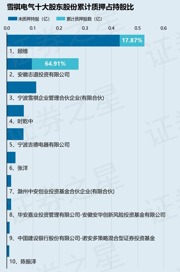 截止本公告日,股东顾维已累计质押股份940.0万股,占其持股总数的17.87%,股东安徽志道投资有限公司已累计质押股份1782.0万股,占其持股总数的64.91%。本次质押后雪祺电气十大股东的累计质押股份占持股比例(占持股比例的计算以公司最新一期财务报表公布的十大股东的持股总数为基准)见下图: