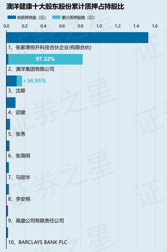 截止本公告日,股东澳洋集团有限公司已累计质押股份8000.0万股,占其持股总数的97.32%,股东沈卿已累计质押股份600.0万股,占其持股总数的34.95%。本次质押后澳洋健康十大股东的累计质押股份占持股比例(占持股比例的计算以公司最新一期财务报表公布的十大股东的持股总数为基准)见下图: