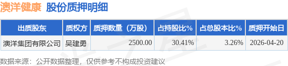 证券之星消息,澳洋健康(002172)4月23日公开信息显示,股东澳洋集团有限公司向吴建勇合计质押2500.0万股,占总股本3.26%。质押详情见下表: