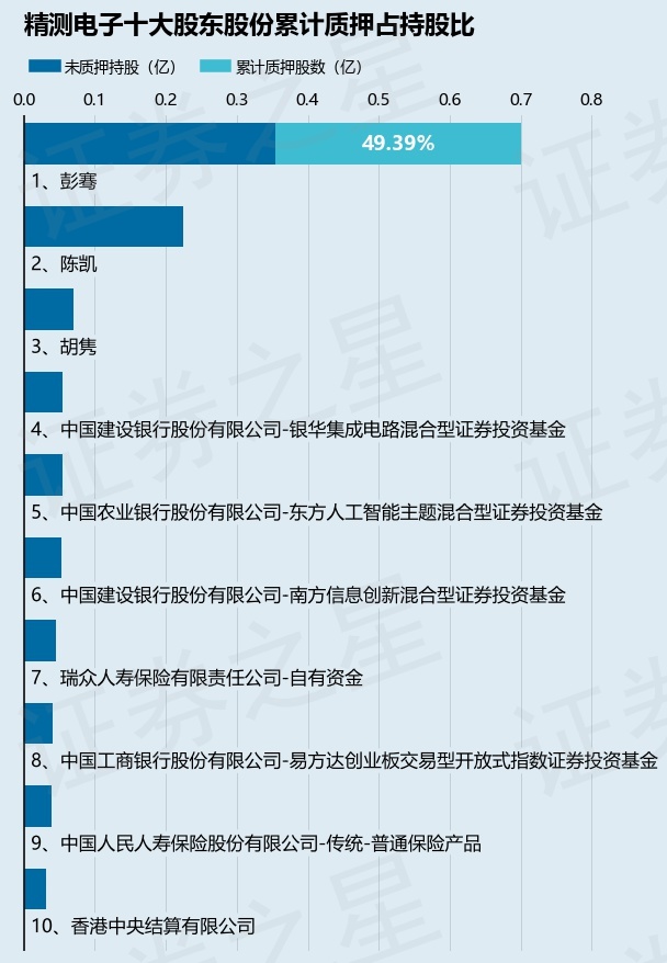 截止本公告日,股东彭骞已累计质押股份3462.5万股,占其持股总数的49.39%。本次质押后精测电子十大股东的累计质押股份占持股比例(占持股比例的计算以公司最新一期财务报表公布的十大股东的持股总数为基准)见下图: