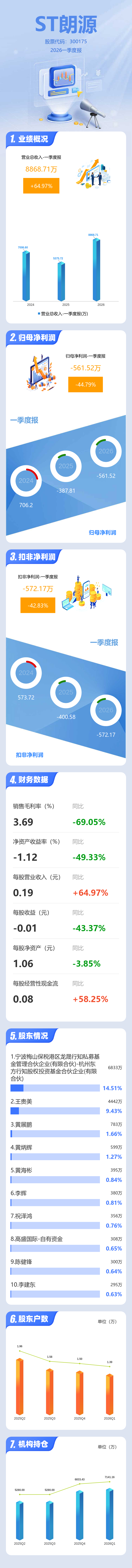 证券之星消息,ST朗源2026年一季报显示,一季度公司主营收入8868.71万元,同比上升64.98%;归母净利润-561.52万元,同比下降44.79%;扣非净利润-572.17万元,同比下降42.83%;负债率10.13%,财务费用134.26万元,毛利率3.69%。