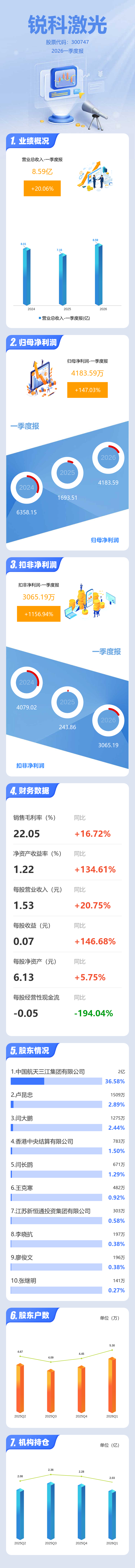 证券之星消息,锐科激光2026年一季报显示,一季度公司主营收入8.59亿元,同比上升20.06%;归母净利润4183.59万元,同比上升147.04%;扣非净利润3065.19万元,同比上升1156.95%;负债率32.39%,财务费用458.89万元,毛利率22.05%。