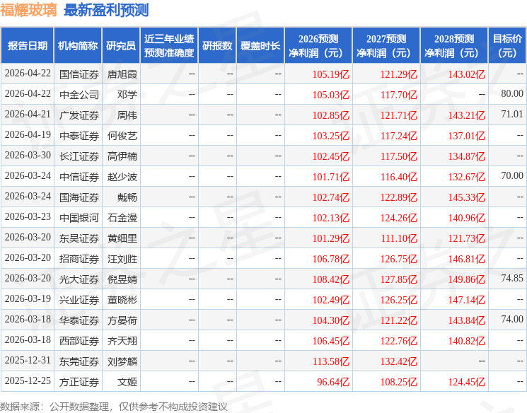 盈利预测与投资评级:考虑到因外汇波动导致公司汇兑亏损等情况,我们维持公司2026年归母净利润预测101.29亿元,将2027-2028年的归母净利润预测从111.10亿元/121.73亿元调整至110.70亿元/121.33亿元,对应的EPS分别为3.88元、4.24元、4.65元,市盈率分别为15.56倍、14.24倍、12.99倍,公司作为全球汽玻龙头仍处估值低位,看好公司长期稳健发展,维持“买入”评级。