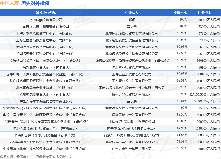 证券之星消息,根据天眼查APP显示,中国人寿(601628.SH)新增一起对外投资事件,被投资公司为重庆国寿养老产业私募股权投资基金合伙企业(有限合伙),法定代表人国寿启远(北京)养老产业投资管理有限公司,投资占比为-。该公司从事资本市场服务,注册资本为850000万人民币。目前,中国人寿共存在对外投资303项,投资占比前20的项目见下表: