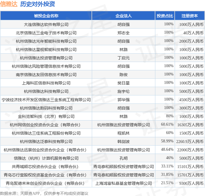 证券之星消息,根据天眼查APP显示,信雅达(600571.SH)新增一起对外投资事件,被投资公司为青岛聚德未来创业投资合伙企业(有限合伙),法定代表人上海鸿富私募基金管理有限公司,投资占比为21.51%。该公司从事商务服务业,注册资本为9300万人民币。目前,信雅达共存在对外投资30项,投资占比前20的项目见下表: