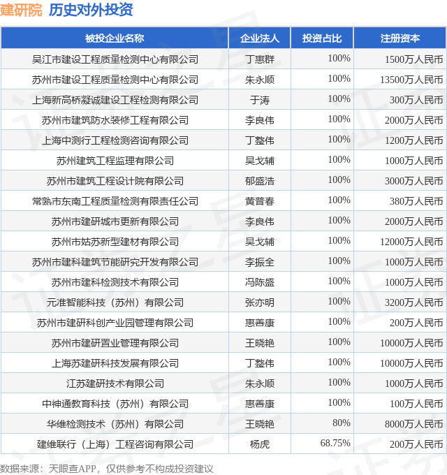 通过天眼查大数据分析,苏州市建筑科学研究院集团股份有限公司共对外投资了38家企业,参与招投标项目102次;财产线索方面有商标信息84条,专利信息92条,著作权信息13条;此外企业还拥有行政许可16个。据2025年报数据,建研院商誉3.27亿元,同比减4.85%。