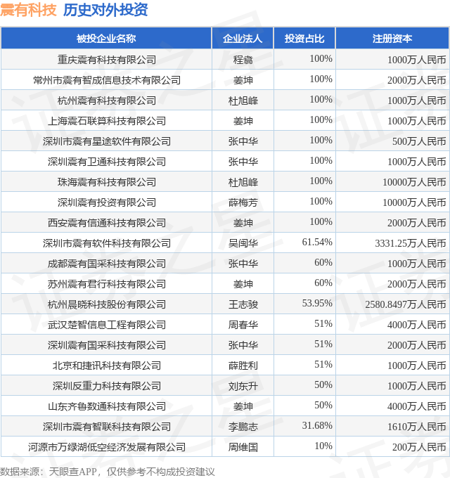 证券之星消息,根据天眼查APP显示,震有科技(688418.SH)新增一起对外投资事件,被投资公司为重庆震有科技有限公司,法定代表人程翥,投资占比为100%。该公司从事软件和信息技术服务业,注册资本为1000万人民币。目前,震有科技共存在对外投资22项,投资占比前20的项目见下表: