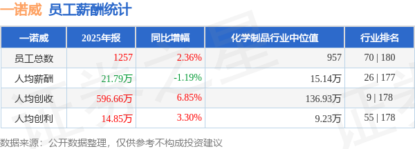 证券之星消息,4月22日一诺威公布2025年年报,当年营收75.0亿元,同比增9.37%;净利润为1.87亿元,同比增5.73%。根据财报数据披露,当年公司员工总数1257人,同比增2.36%;人均薪酬21.79万元,同比减1.19%;人均创收596.66万元,同比增6.85%;人均创利14.85万元,同比增3.3%;公司员工薪酬统计见下表: