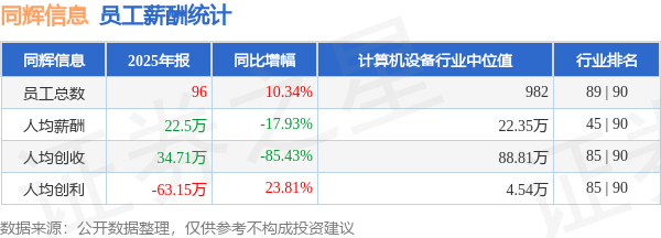 证券之星消息,4月22日同辉信息公布2025年年报,当年营收3332.51万元,同比减83.92%;净利润为-6062.31万元,同比增15.93%。根据财报数据披露,当年公司员工总数96人,同比增10.34%;人均薪酬22.5万元,同比减17.93%;人均创收34.71万元,同比减85.43%;公司员工薪酬统计见下表: