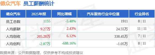证券之星消息,4月22日德众汽车公布2025年年报,当年营收23.71亿元,同比增0.3%;净利润为-3128.97万元,同比减653.07%。根据财报数据披露,当年公司员工总数1155人,同比减5.48%;人均薪酬9.27万元,同比增2.43%;人均创收205.28万元,同比增6.12%;公司员工薪酬统计见下表: