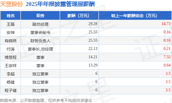 证券之星消息,天罡股份发布2025年年报,数据显示:公司主营收入3.52亿元,同比增17.52%。归母净利润为7681.3万元,同比增3.36%。扣非净利润为7166.82万元,同比增7.99%。当年公司员工总数364人,同比增1.68%。人均薪酬14.21万元(注:"人均薪酬"根据定期报告中"应付职工薪酬"附注的本期增加值 / 员工总数计算而来),同比增4.85%。人均创收96.75万元,同比增15.58%。人均创利21.1万元,同比增1.66%。其中管理层薪酬总额为148.01万元,同比上一年增4.12%,薪酬最高的为副总经理王磊,薪酬29.28万元。