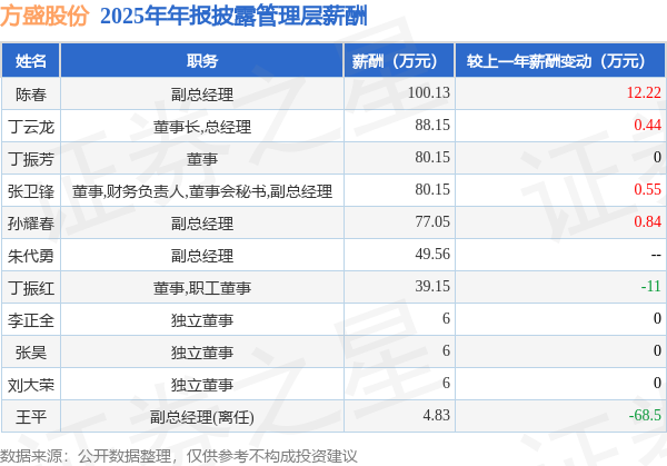 证券之星消息,方盛股份发布2025年年报,数据显示:公司主营收入3.86亿元,同比增11.31%。归母净利润为1983.32万元,同比减33.47%。扣非净利润为1783.36万元,同比减30.94%。当年公司员工总数478人,同比减1.04%。人均薪酬16.18万元(注:"人均薪酬"根据定期报告中"应付职工薪酬"附注的本期增加值 / 员工总数计算而来),同比增6.02%。人均创收80.84万元,同比增12.47%。人均创利4.21万元,同比减32.17%。其中管理层薪酬总额为537.17万元,同比上一年减13.13%,薪酬最高的为副总经理陈春,薪酬100.13万元。