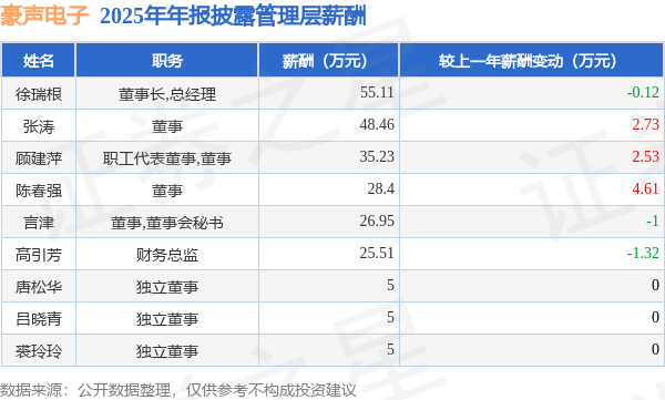 证券之星消息,豪声电子发布2025年年报,数据显示:公司主营收入8.95亿元,同比增11.93%。归母净利润为7005.06万元,同比减59.15%。扣非净利润为6783.12万元,同比增188.63%。当年公司员工总数1175人,同比增0.43%。人均薪酬11.98万元(注:"人均薪酬"根据定期报告中"应付职工薪酬"附注的本期增加值 / 员工总数计算而来),同比减1.15%。人均创收76.16万元,同比增11.45%。人均创利5.96万元,同比减59.33%。其中管理层薪酬总额为234.66万元,同比上一年减32.32%,薪酬最高的为董事长,总经理徐瑞根,薪酬55.11万元。