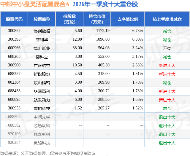 从基金规模来看,中邮中小盘灵活配置混合A基金2026年一季度公布的基金规模为1.74亿元,较上一期规模2.01亿元变化了-2681.07万元,环比变化了-13.36%。该基金最新一期资产配置为:股票占净值比72.5%,无债券类资产,现金占净值比26.63%。从基金持仓来看,该基金当季前十大股票仓位达30.27%,第一大重仓股为协创数据(300857),持仓占比为6.73%。