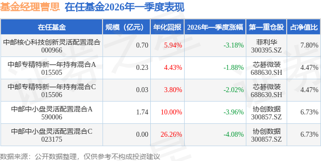 证券之星消息,日前中邮中小盘灵活配置混合A基金公布一季报,2026年一季度最新规模1.74亿元,季度净值涨幅为-3.96%。