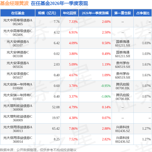 光大信用添益债券A现任基金经理为黄波。其中在任基金经理黄波已从业6年又198天,2019年10月9日正式接手管理光大信用添益债券A,任职期间累计回报为103.78%。目前还管理着12只基金产品(包括A类和C类),其中本季度表现最佳的基金为光大信用添益债券A(360013),季度净值涨幅为2.88%。