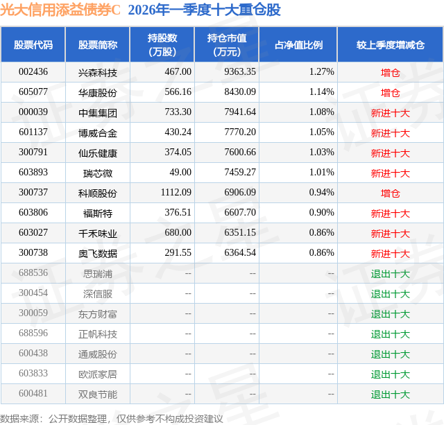 从基金规模来看,光大信用添益债券C基金2026年一季度公布的基金规模为8.25亿元,较上一期规模7.12亿元变化了1.13亿元,环比变化了15.88%。该基金最新一期资产配置为:股票占净值比17.72%,债券占净值比92.43%,现金占净值比3.38%。从基金持仓来看,该基金当季前十大股票仓位达10.14%,第一大重仓股为兴森科技(002436),持仓占比为1.27%。