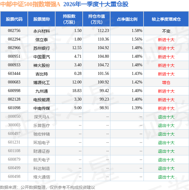 从基金规模来看,中邮中证500指数增强A基金2026年一季度公布的基金规模为0.57亿元,较上一期规模3372.52万元变化了2358.7万元,环比变化了69.94%。该基金最新一期资产配置为:股票占净值比93.69%,无债券类资产,现金占净值比6.49%。从基金持仓来看,该基金当季前十大股票仓位达14.62%,第一大重仓股为永兴材料(002756),持仓占比为1.58%。