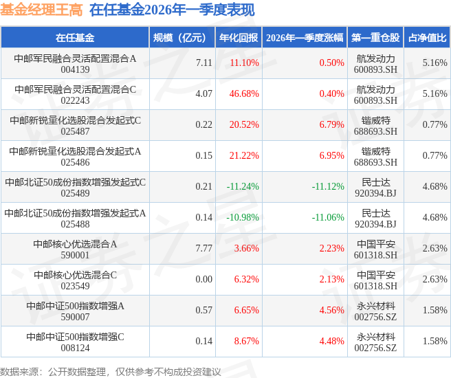 证券之星消息,日前中邮中证500指数增强A基金公布一季报,2026年一季度最新规模0.57亿元,季度净值涨幅为4.56%。