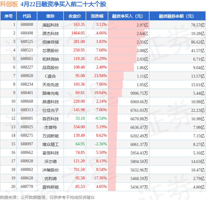 科创板融资净买入前三分别为:澜起科技(688008)融资净买入2.97亿元、源杰科技(688498)融资净买入2.64亿元、佰维存储(688525)融资净买入2.35亿元,前20具体见下表: