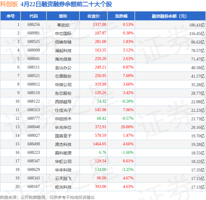 科创板融资融券余额前三分别为:寒武纪(688256)融资融券余额180.41亿元、中芯国际(688981)融资融券余额116.45亿元、佰维存储(688525)融资融券余额86.62亿元,前20具体见下表:
