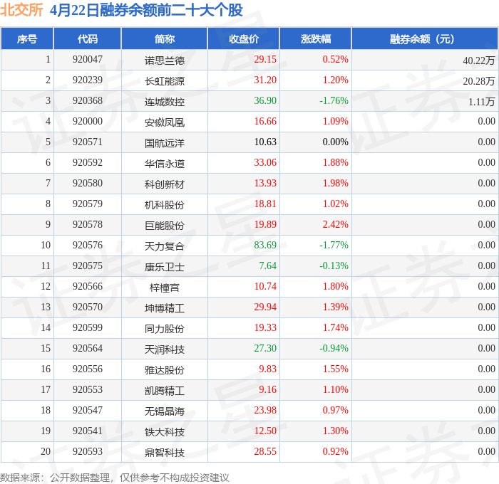 北交所融券余额前三分别为:诺思兰德(920047)融券余额40.22万元、长虹能源(920239)融券余额20.28万元、连城数控(920368)融券余额1.11万元,前20具体见下表: