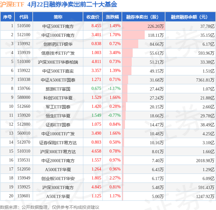 沪深ETF融券净卖出前三分别为:中证500ETF南方(510500)融券净卖出226.2万股、中证1000ETF南方(512100)融券净卖出118.11万股、创新药ETF银华(159992)融券净卖出84.66万股,前20具体见下表: