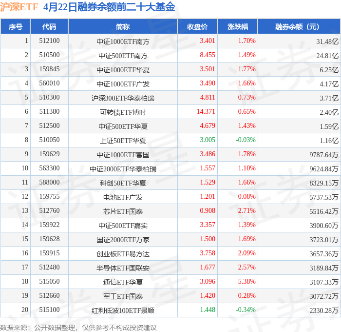 沪深ETF融券余额前三分别为:中证1000ETF南方(512100)融券余额31.48亿元、中证500ETF南方(510500)融券余额24.81亿元、中证1000ETF华夏(159845)融券余额6.25亿元,前20具体见下表: