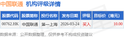 投行对该股的评级以买入为主,近90天内共有1家投行给出买入评级,近90天的目标均价为10港元。第一上海最新一份研报给予中国联通买入评级,目标价10港元。