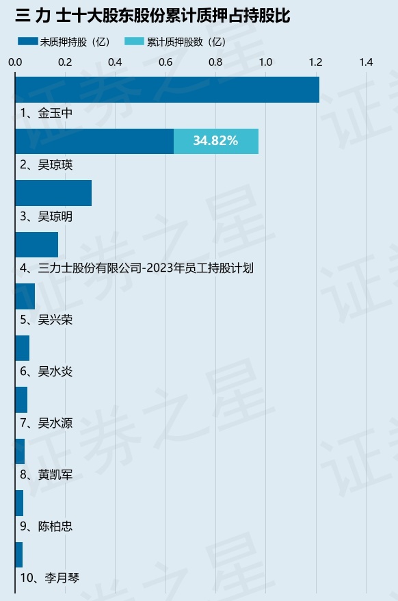 截止本公告日,股东吴琼瑛已累计质押股份3380.0万股,占其持股总数的34.82%。本次质押后三 力 士十大股东的累计质押股份占持股比例(占持股比例的计算以公司最新一期财务报表公布的十大股东的持股总数为基准)见下图: