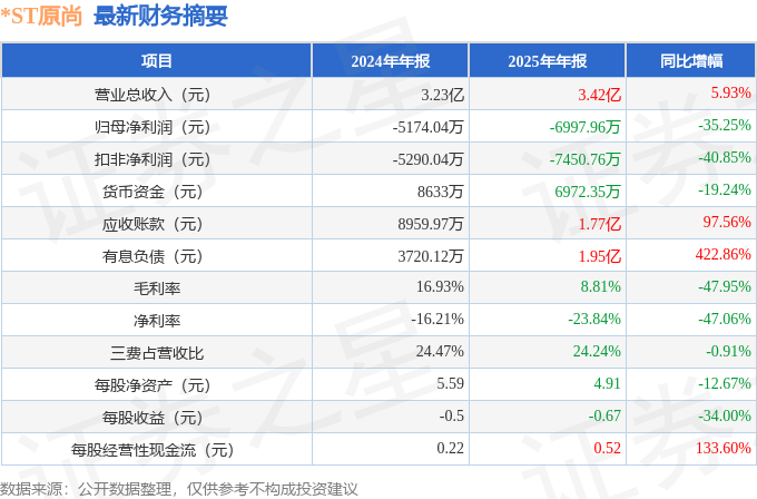据证券之星公开数据整理,近期*ST原尚(603813)发布2025年年报。截至本报告期末,公司营业总收入3.42亿元,同比上升5.93%,归母净利润-6997.96万元,同比下降35.25%。按单季度数据看,第四季度营业总收入9768.26万元,同比上升20.61%,第四季度归母净利润-2944.2万元,同比下降28.35%。本报告期*ST原尚短期债务压力上升,流动比率达0.87。