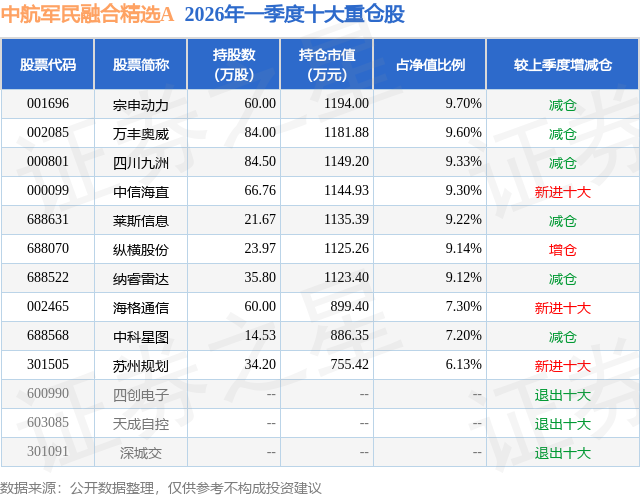 根据2026基金Q1季报公募基金重仓股数据,重仓该股的公募基金共1家,其中持有数量最多的公募基金为中航基金的中航军民融合精选A。中航军民融合精选A目前规模为0.29亿元,最新净值1.4294(4月22日),较上一交易日上涨0.07%,近一年上涨7.63%。该公募基金现任基金经理为韩浩。韩浩在任的基金产品包括:中航新起航灵活配置混合A,管理时间为2018年4月23日至今,期间收益率为-3.52%;中航华证商飞高端制造产业指数发起A,管理时间为2023年3月7日至今,期间收益率为1.94%;中航机遇领航混合发起A,管理时间为2023年8月10日至今,期间收益率为375.35%。