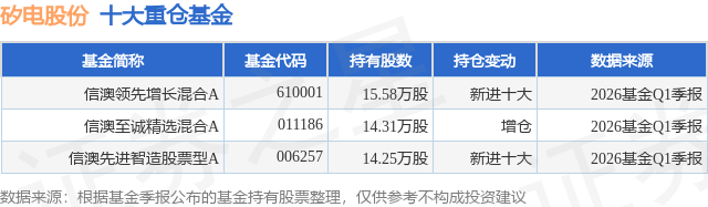 根据2026基金Q1季报公募基金重仓股数据,重仓该股的公募基金共3家,其中持有数量最多的公募基金为信达澳亚基金的信澳领先增长混合A。信澳领先增长混合A目前规模为6.77亿元,最新净值1.743(4月22日),较上一交易日上涨2.77%,近一年上涨24.34%。该公募基金现任基金经理为齐兴方。齐兴方在任的基金产品包括:信澳先进智造股票型A,管理时间为2022年11月14日至今,期间收益率为15.37%;信澳至诚精选混合A,管理时间为2025年10月29日至今,期间收益率为25.53%;信澳高端装备混合A,管理时间为2025年11月11日至今,期间收益率为3.85%。