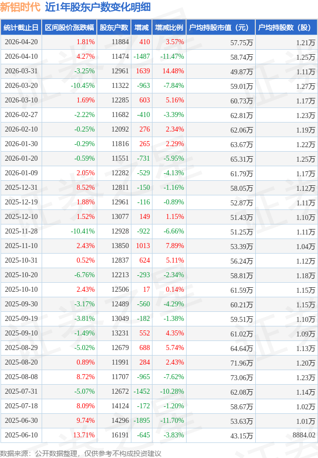 从股价来看,2026年4月10日至2026年4月20日,新铝时代区间涨幅为1.81%,在此期间股东户数增加410.0户,增幅为3.57%。