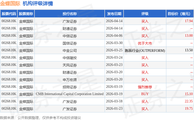 截至2026年4月23日收盘,金蝶国际(00268.HK)报收于8.9港元,下跌1.0%,成交量1990.6万股,成交额1.77亿港元。投行对该股的评级以买入为主,近90天内共有9家投行给出买入评级,近90天的目标均价为16.94港元。广发证券最新一份研报给予金蝶国际买入评级,目标价17.94港元。