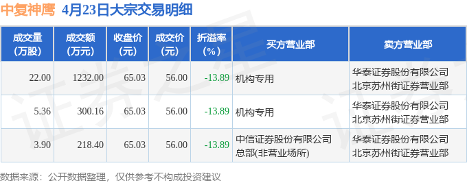 证券之星消息,4月23日中复神鹰发生大宗交易,交易数据如下: