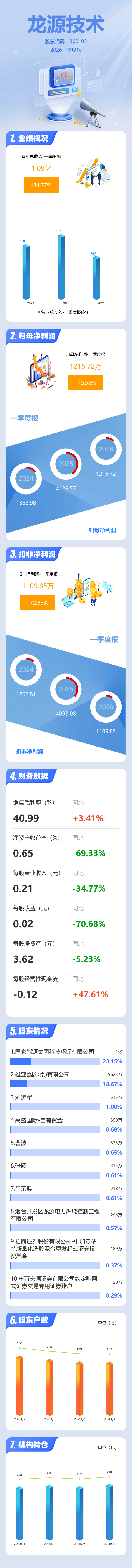 证券之星消息,龙源技术2026年一季报显示,一季度公司主营收入1.09亿元,同比下降34.78%;归母净利润1215.72万元,同比下降70.56%;扣非净利润1109.85万元,同比下降72.88%;负债率28.14%,投资收益13.62万元,财务费用-311.39万元,毛利率40.99%。